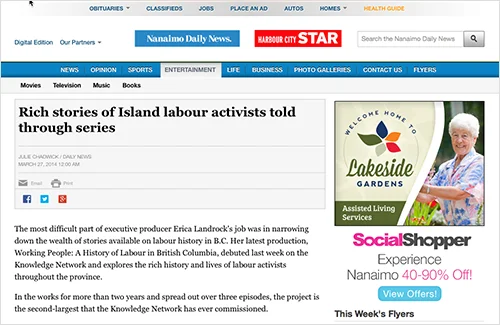 Rich Stories of Island Labour Activists Told Through Series - Nanaimo Daily News - March 27, 2014 // Working People: A History of Labour in British Columbia