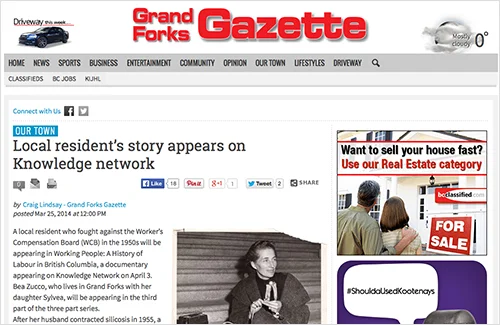 Local Resident's Story Appears on Knowledge Network - Grand Forks Gazette - March 25, 2014 // Working People: A History of Labour in British Columbia