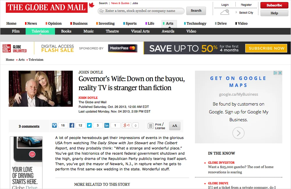 Governor's Wife: Down on the bayou, reality TV is stranger than fiction - The Globe and Mail - October 26, 2014 // Rise of the eSports Hero