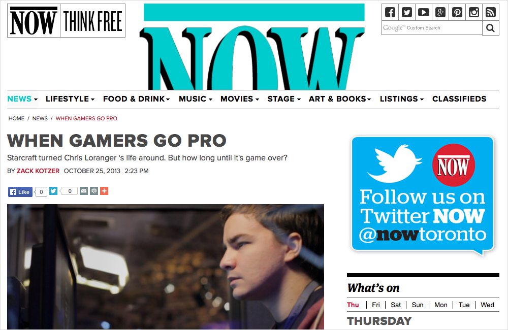 When Gamers Go Pro: Starcraft turned Chris Loranger's life around. But how long until it's game over? - NOW Magazine Toronto - October 24, 2013 // Rise of the eSports Hero